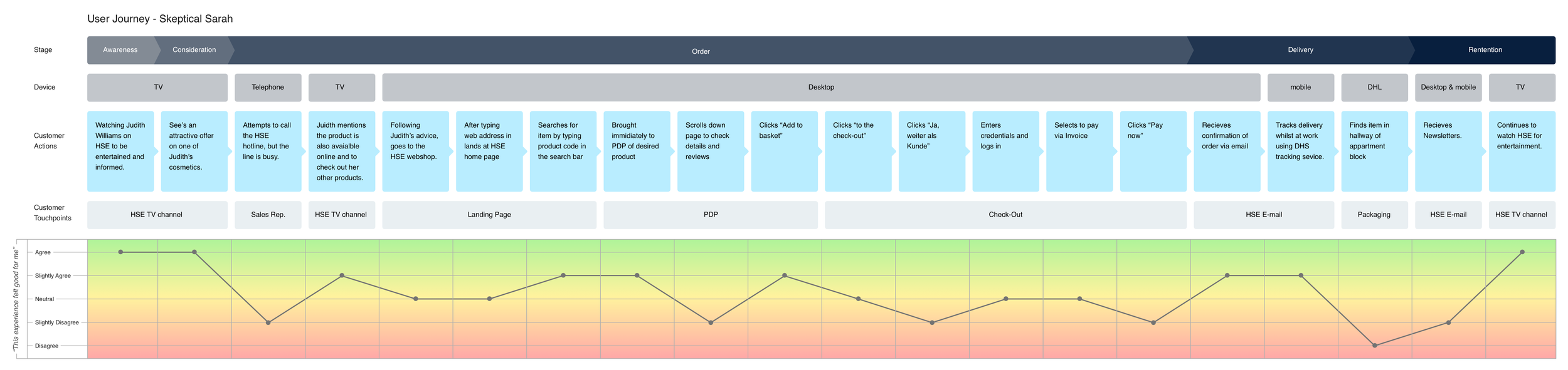 Model representing the highs and lows I found in a basic UX audit from the point of view of “Sceptical Sarah” (one of our 6 user personas)